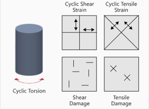 図 2. 繰り返しまたはねじりによるせん断ひずみ、引張引張ひずみ、せん断損傷、引張損傷