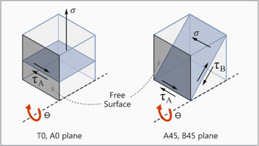 臨界平面法では、任意の損傷モデルを使用できます。その損傷モデルでは、損傷が最も激しい平面を検索する必要があります。考えられる損傷(破壊)モードには2種類があります。1つは引張による亀裂成長で、フリーサーフェスと直交する平面で発生します。角度θは、サーフェス上で確認された亀裂がσx方向に対して成す角度です。もう1つの破壊系は、せん断による亀裂成長で、サーフェスに対して45°を成す平面で発生します。この平面では、平面内せん断応力と平面外せん断応力の両方が考慮されます。θは、サーフェス上で任意の値を取ることができます。せん断応力τAは平面内せん断応力であり、サーフェス上で微小亀裂が成長する原因になります。最大平面外せん断応力τBは、フリーサーフェスに対して45°を成す平面上で発生し、サーフェスに向かって微小亀裂が成長する原因になります。