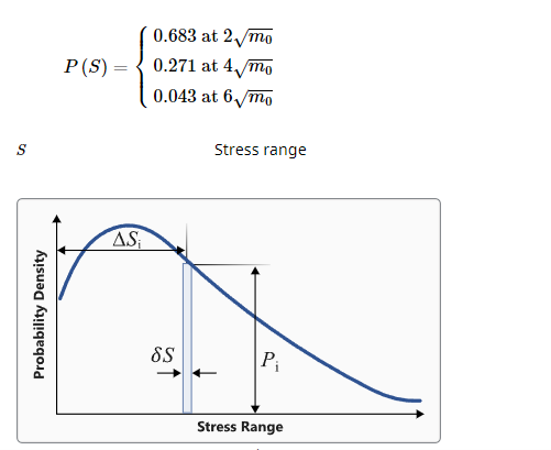 - 応力のPSDモーメントから対応するモーメントを算出し、これを用いて応力範囲の確率密度関数を決定します。