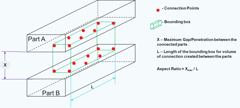 - 結合検索アルゴリズムによって検出された値です。正の値はギャップ、負の値は貫通であることをそれぞれ示しています。注: ボルト軸やナットのネジ部では、特殊な接続が行われます。SimSolidは、物理的なギャップ / 許容範囲に関わらず、これらの場所でギャップ / 貫通がないことを想定しています。そのような接続の場合、この欄にはNA(not applicable)が表示されます。