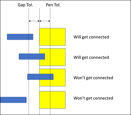 SimSolidでは、近接基準を使用して結合が判断されます。パートが近接しているかどうかを確定するために、2つのトレランスとして絶対ギャップトレランスと絶対貫通トレランスを使用します。パートが絶対ギャップトレランス基準を満たすうえで十分に近い場合または絶対貫通トレランス基準を満たすようにわずかに相互貫通している場合は、パートが接触していて結合が確立していると見なされます。