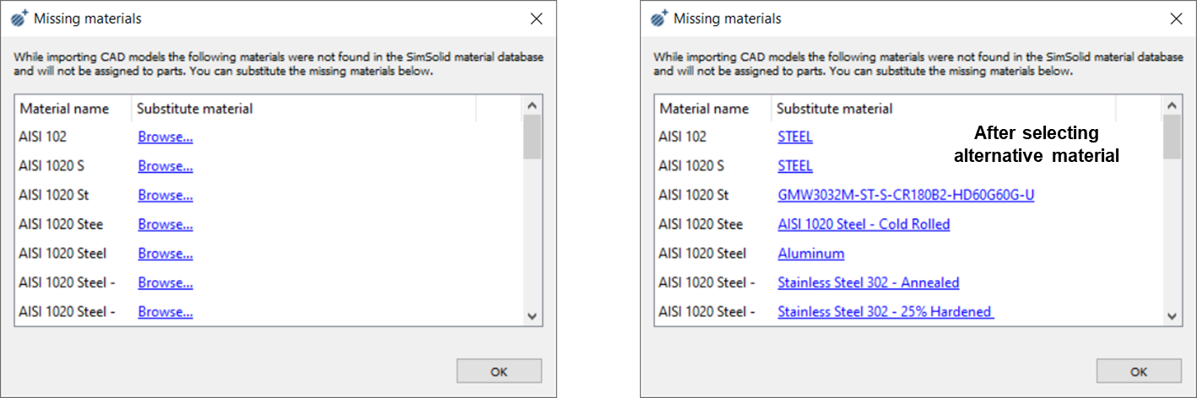 - SimSolidは、材料特性名の文字列が使用された名前のパートメタデータ属性を探して読み取ろうとします。この名前の文字列が、SimSolidの材料データベースにある既存の名前と一致した場合は、SimSolid側のその名前の材料特性が適用されます。名前が一致する属性が見つからなかった場合は、適用できる材料特性がないことがSimSolidによって通知されます。注: SimSolidでは、CAD材料特性データの一般的なインプリントをサポートしていません。現在のところ、SimSolidはCATIA、NX、JTのみをサポートしているので、Import materialsオプションがすべてのCADファイルで機能するわけではありません。CADシステムに存在する材料特性定義を複製する方法については、カスタム材料データベースの定義をご参照ください。