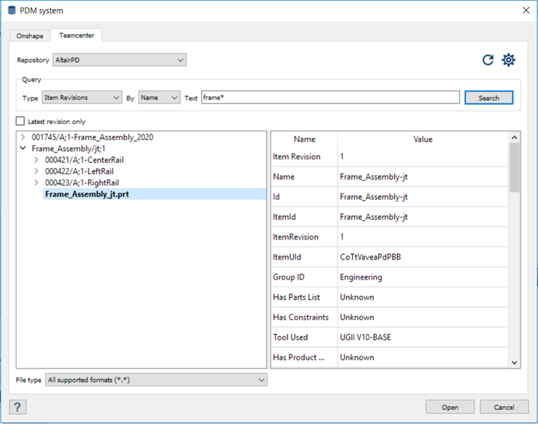 マスターファイルを選択するとアセンブリ全体を開くことができ、単一のファイルを選択するとパートを開くことができます。