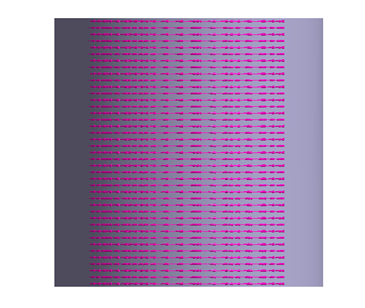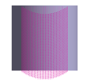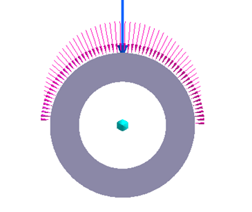 荷重は圧力として適用され、その大きさが荷重のスパン角度の範囲を正弦波分布で広がります。非線形構造解析で、パートに大きな変形が発生すると、軸受圧力はパートのジオメトリの変化に追従するので、軸受圧力は追従荷重であると仮定します。圧力は、パートの変形したフェイスと垂直な方向を必ず維持します。
