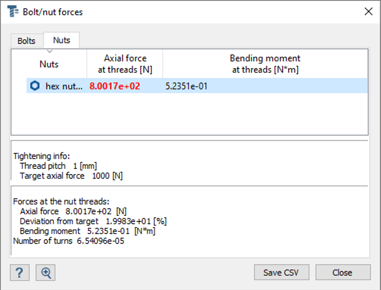 図 1. - Bolt/Nut forcesダイアログでは、偏差の大きいナットが赤で表示され、目標からの偏差が一覧表示されます。