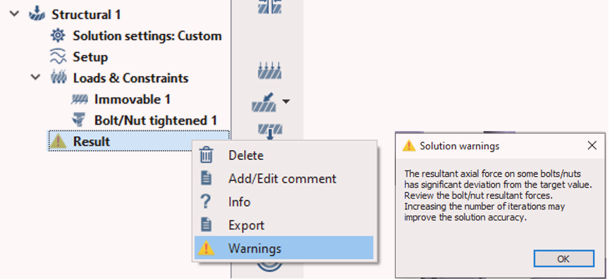 注: ナットの軸合力が10%以上逸れると、以下が発生します:- で、Resultsブランチの横に警告アイコンが表示されます。Resultsを右クリックし、Warningsを選択して表示します。