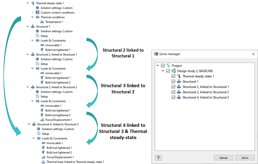 - OKをクリックします。モデルに温度が適用されます。モデルの中で温度を規定していないすべての場所の温度がアプリケーションによって求められます。注: 複数の親を持つ構造逐次解析を熱定常サブケースとリンクして解く場合は、すべての荷重ケースを設定した後にソルバーマネージャーを使用してください。図1を参照してください。ワークフローの最初に熱 - 定常サブケースを作成し、後に複数の親を持つ構造 - 重ね合わせ用サブケースとリンクできるようにすることをお勧めします。