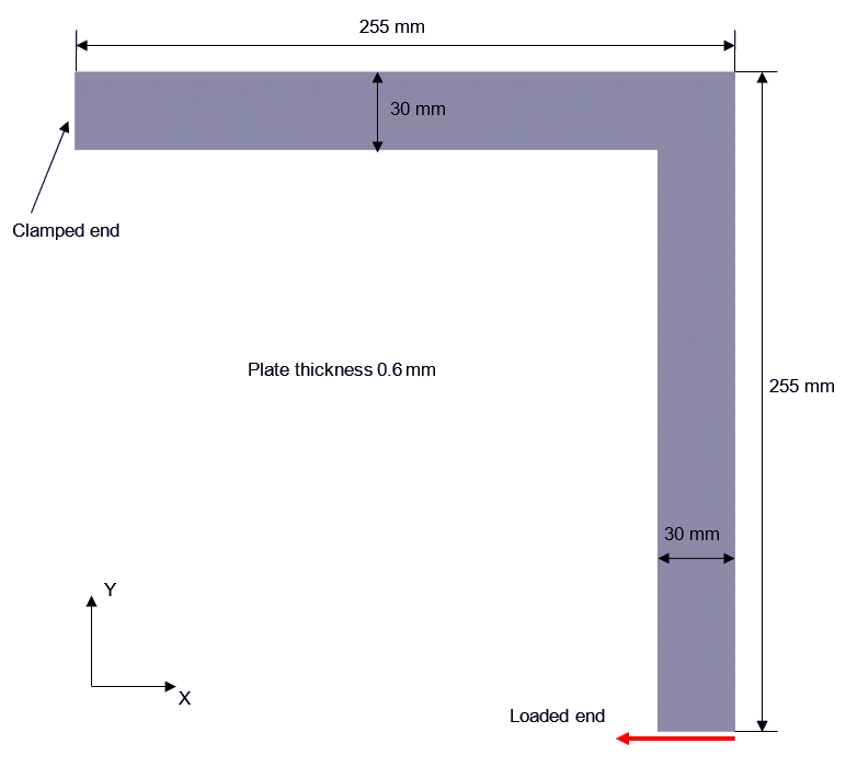 直角の形状における薄肉フレームのような構造の座屈と座屈後の解析を実行します(図 1)。構造の一方の端を固定し、もう一方の端にX方向の控え目な荷重を適用します。