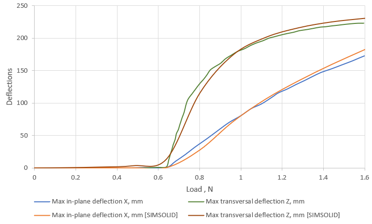 図 2 は、最大たわみ量と適用された荷重の関係を示しています。荷重-横方向たわみ曲線は、参考文献で報告されている結果とよく一致しています。横方向の座屈後の挙動は、最初は非常に小さい横方向の剛性に関連していますが、その後、耐荷重容量が増加します(荷重-変位曲線が平坦になります)。面内挙動はほぼ単調であり、荷重変動の範囲内では容量の増加は生じません。