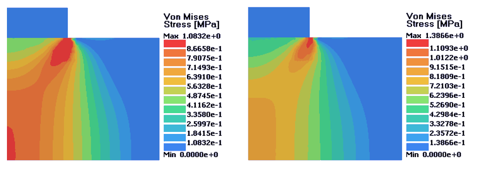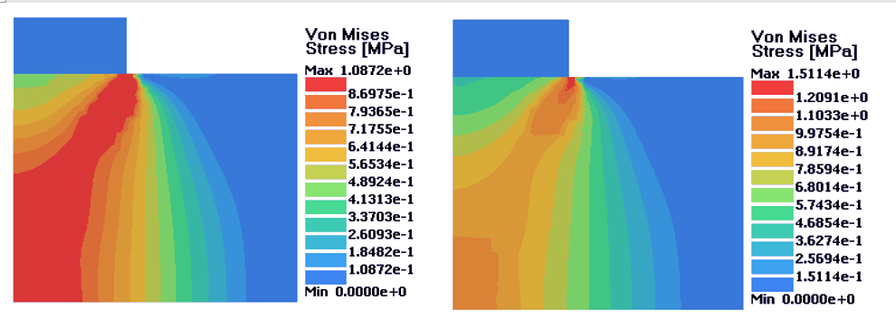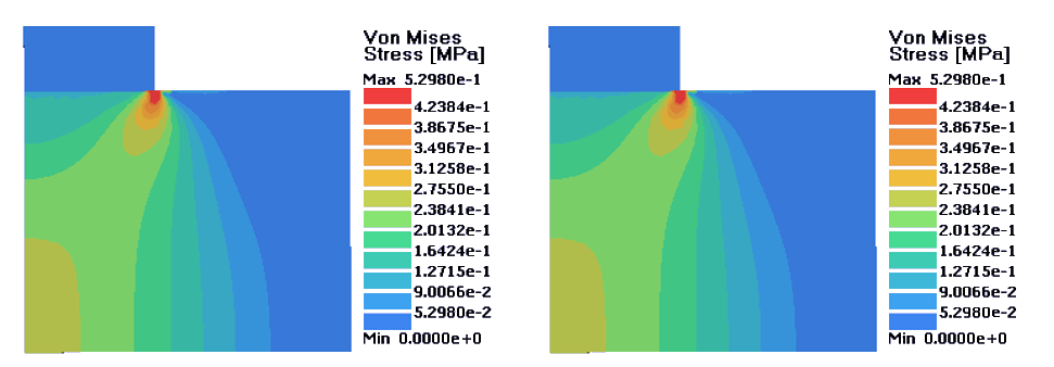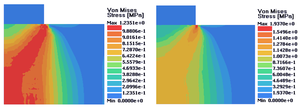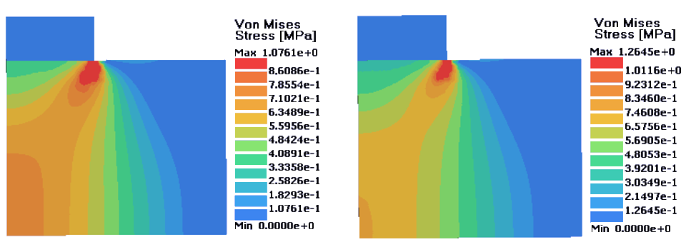 図 5. 左:完全塑性材料;右;等方的硬化材料. D = 0.14 mm