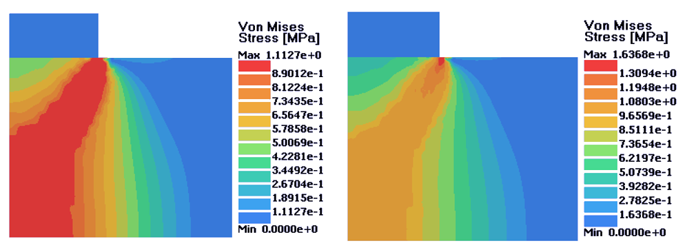 図 6. 左:完全塑性材料;右;等方的硬化材料. D = 0.16 mm