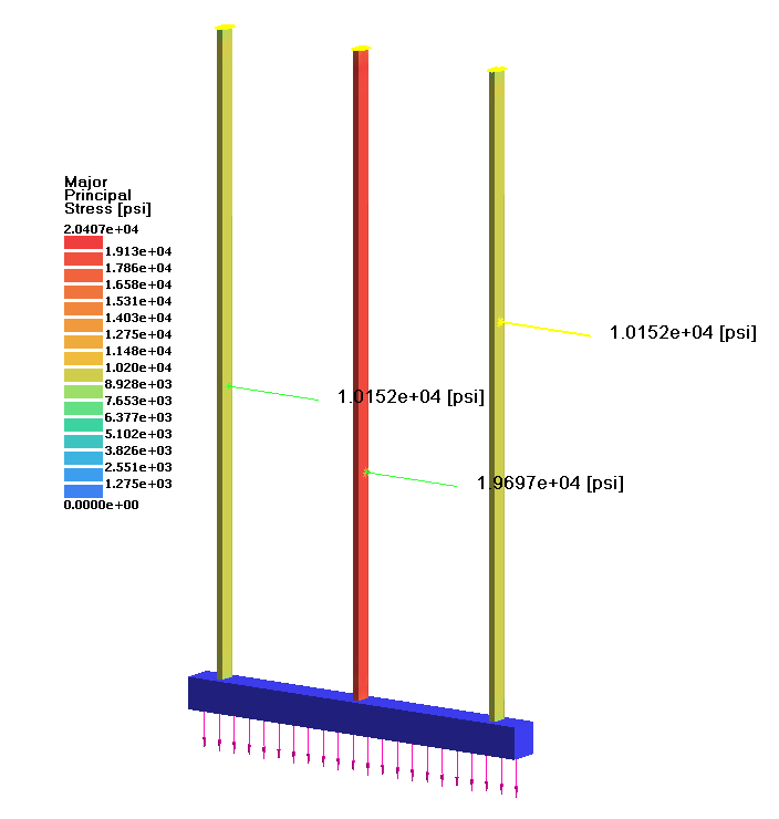 剛体梁に適用される総荷重は4000 lbfで、温度変化は10度Fです。バーの断面積は 0.1インチ2、長さは20インチです。