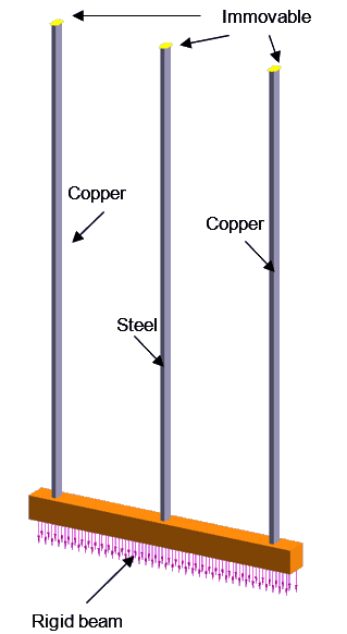テスト番号VTL01 荷重と均等な温度上昇を受ける剛性のある梁、鋼製、銅製のバーを用いた支持構造の応力を求めます。
