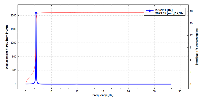 励振振動数が板の最初の固有振動数に等しくなると、ピーク応答に達します。図 3 は、選択したポイント(座標 [m] X = 4.9627, Y = 0.05, Z = -5.0418)のY変位に対するPSD応答を示しています。