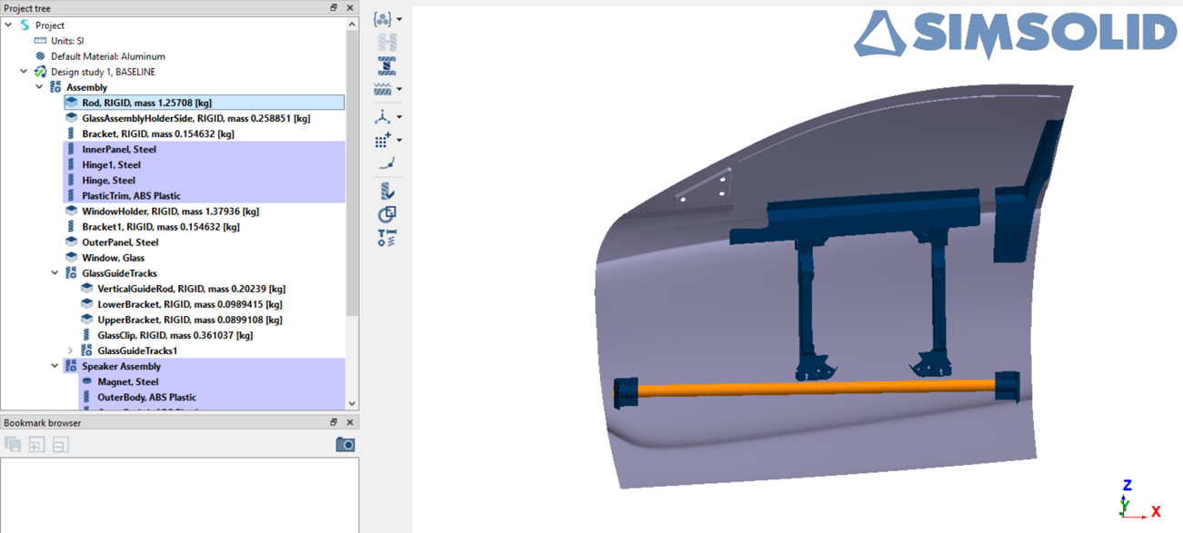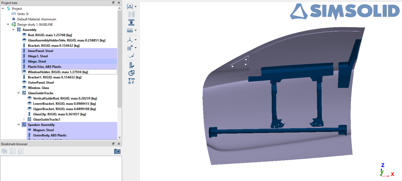 SimSolidで車のドアのアセンブリに剛体パートを設定します。