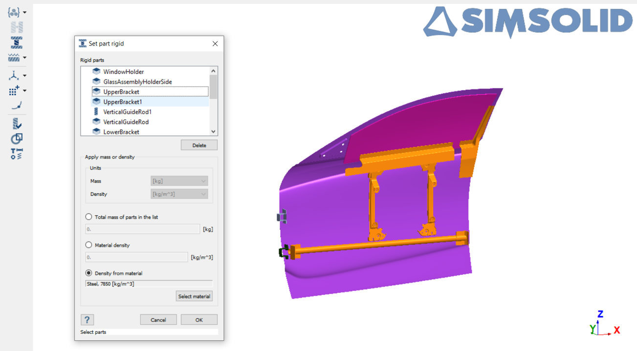 - SimSolidでは、選択したパートの総質量または密度を指定することで、剛体の質量を定義することもできます。