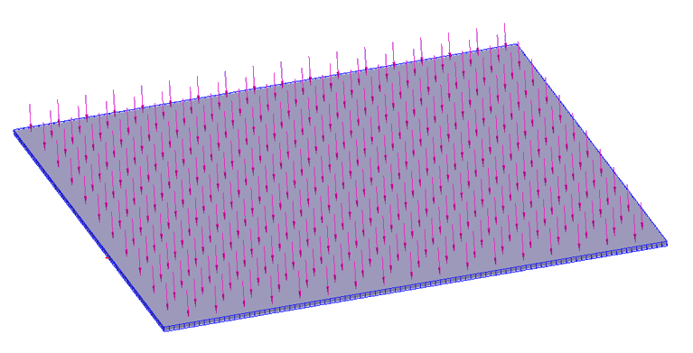 方板被模拟成一个 3D 实体。为了施加铰支座,在板的平面中间处创建了载荷线 (