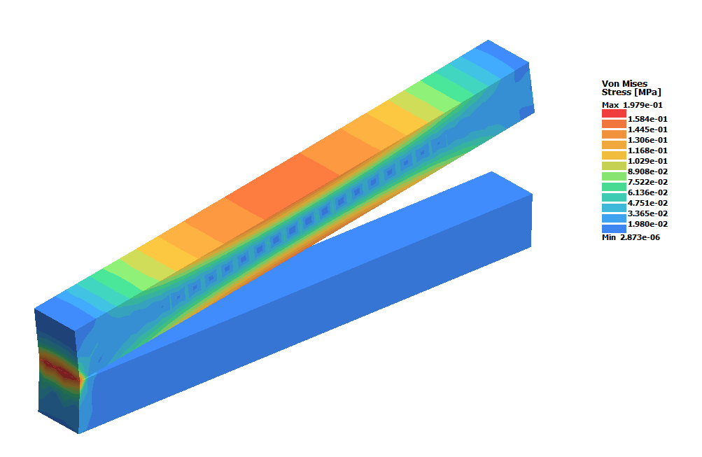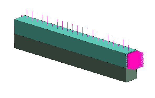 考虑了五种载荷工况。在所有载荷工况下,下梁底部是固定的,上梁在其顶部受力,总垂直荷载为 2N,均匀分布在表面上。上梁的右端承受垂直荷载