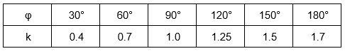 From the first table the values for Zeta 90deg depending on the ratio radius of curvature R to tube diameter d can be taken. The second table specifies values for the factor k depending on the angle of curvature phi (where appropriate interpolation is necessary).