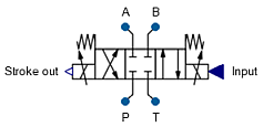 For Input ≥ Input threshold to open the valve the valve switches in positive direction up to right position, for Input ≤ - Input threshold to open the valve the valve switches in negative direction up to left position. For - Input threshold to open the valve < Input < Input threshold to open the valve it switches into resting position (middle position).