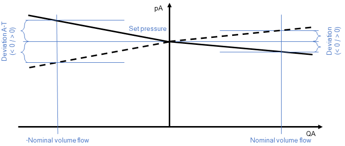 If supply pressure pA is less than Set pressure (relative value) the valve acts like an orifice with the characteristics Nominal volume flow and Nominal pressure difference.