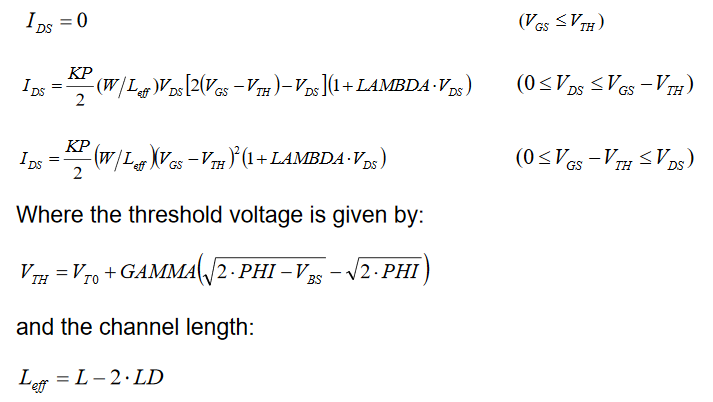 Proposed by Shockley, the equations of the MOS level 1 give the evaluation of the current IDS between the drain and the source as a function of VD, VG and VS.