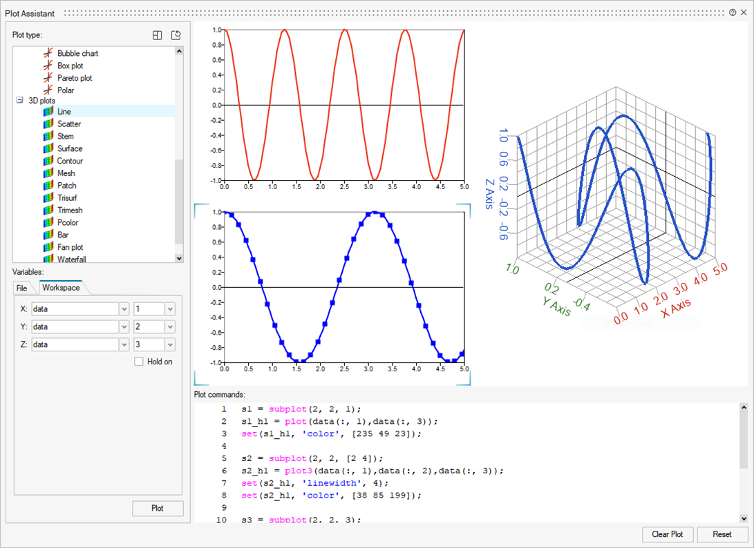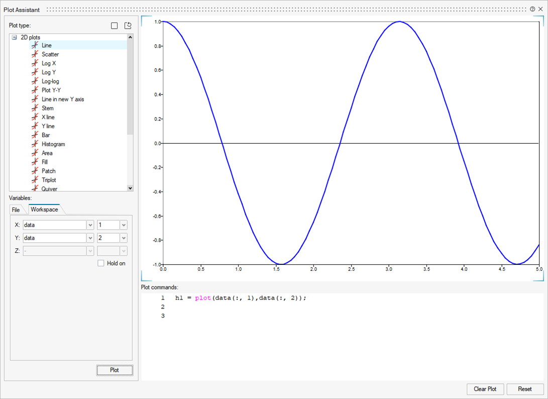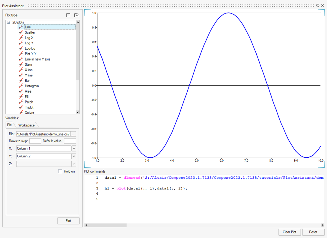 - To clear the Plot Assistant interface and reset it to its initial state, click the Reset button. If the File tab is selected, the demo file is restored and the plot and plot commands are generated.