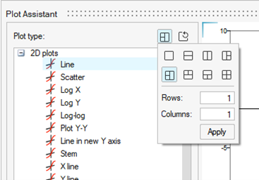 Alternatively, you can type the number of rows and columns and click Apply. The maximum number of rows and columns is four.To plot on a specific subplot, click on it. The blue lines on the subplot corners indicate the active subplot.In the Plot commands window, the commands are grouped per subplot.