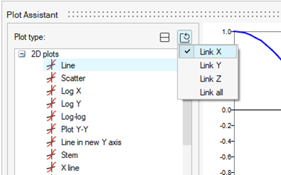 Click Link all to select or deselect all the axes.The selected axes are linked and synced between subplots. For example, if Link X is selected and you zoom in and out, or otherwise change the X axis range on one subplot, then the same range change is applied to the X axis of the other subplots. The Z axis is ignored in 2D plots.