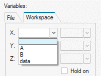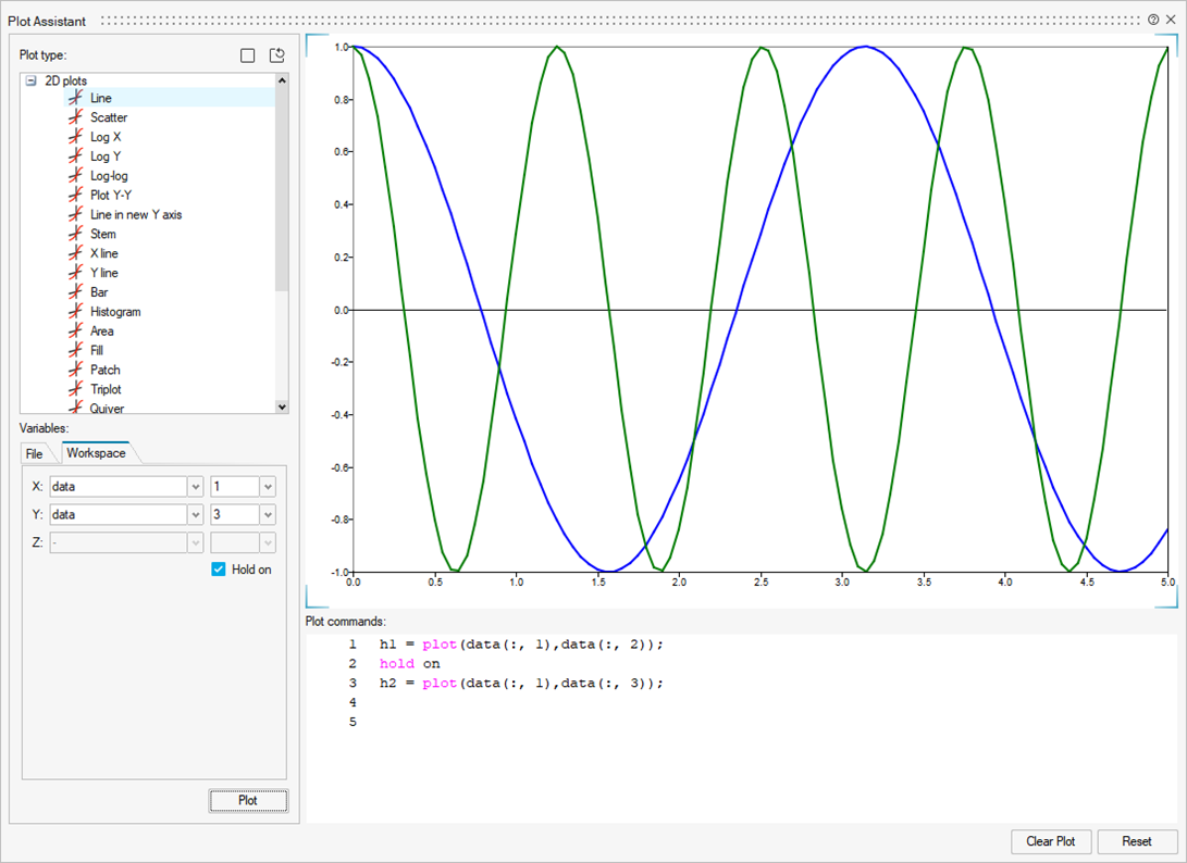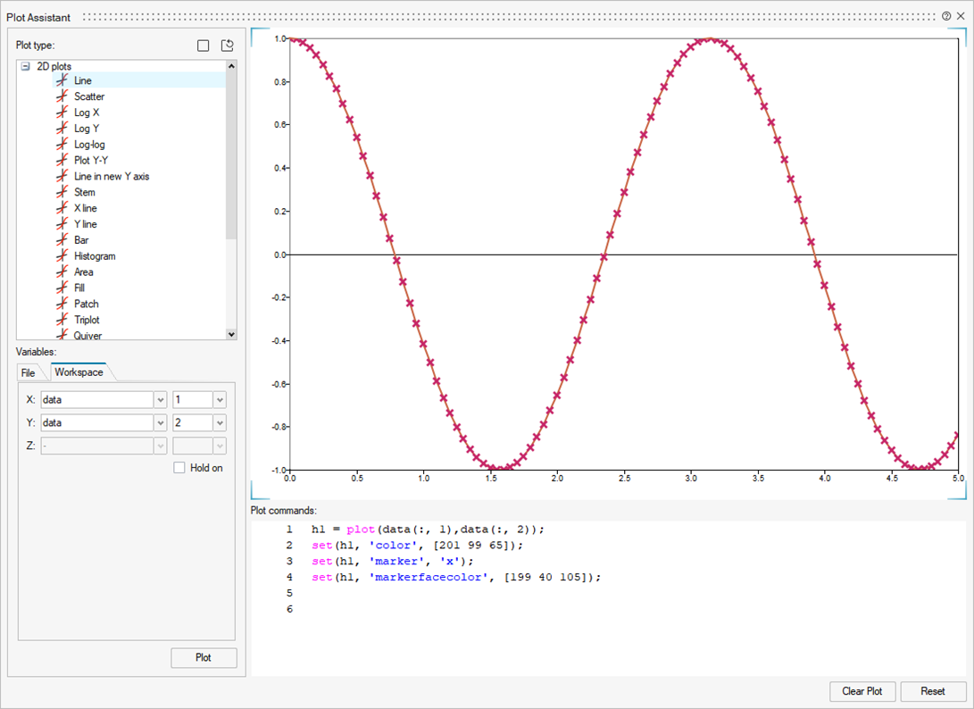 - To clear the active plot and its plot commands without changing the Plot type or Variables, click the Clear Plot button.