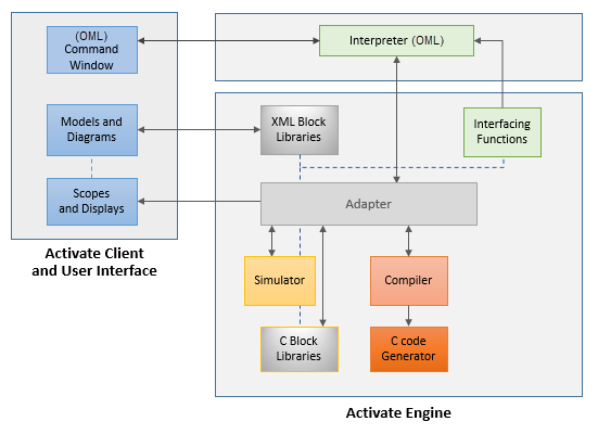 The Twin Activate client provides direct access to the Interpreter through a Command Window that lets you enter OML commands and functions. The software provides features for creating, editing, simulating and managing models and their respective diagrams. The software includes Scope blocks for plotting data, and other display options for visualizing simulation results. The Interpreter evaluates block parameters, function statements and scripts written in OML and entered through the OML command window or OML Editor. The software includes a block library which has a variety of pre-defined blocks for creating models. The Evaluation function is a part of the XML definition of a block. For each block in a model, the Evaluation function is evaluated by the OML Interpreter to obtain actual values. The Adapter is a generic component that interfaces all components of the architecture. The Simulator runs according to the scheduling tables and other information that is provided by the Compiler. The Compiler converts models into a structure of functional blocks, definitions that specify the interconnection of the blocks, and scheduling tables that specify the order in which the blocks are called during the simulation process. Aside from its XML content, each block comes with a simulation function to implement the block definition. Most of the block simulation functions are written in C language and are available to the Simulator as a DLL library. The engine of the software generates C code as required for operations such as the FMI export.