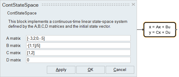 • Defining a model or block parameter with OML statements as you can see in the ContStateSpace block dialog: