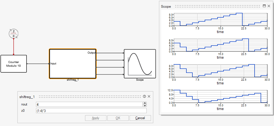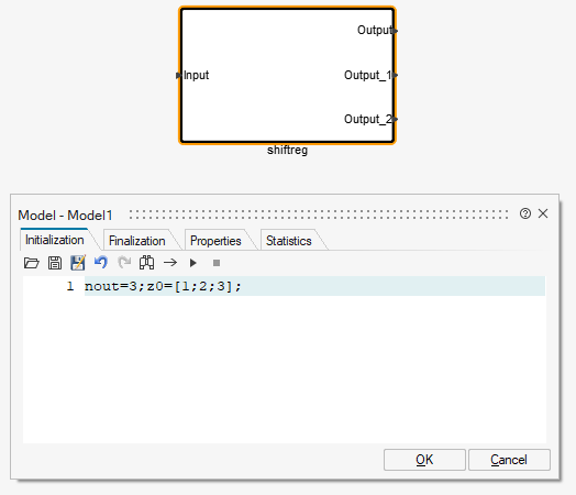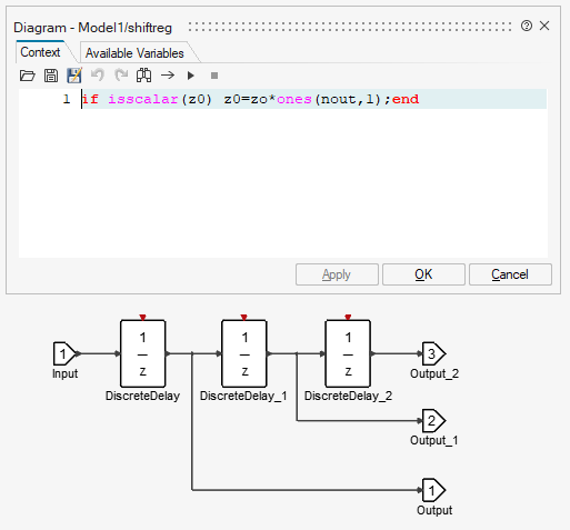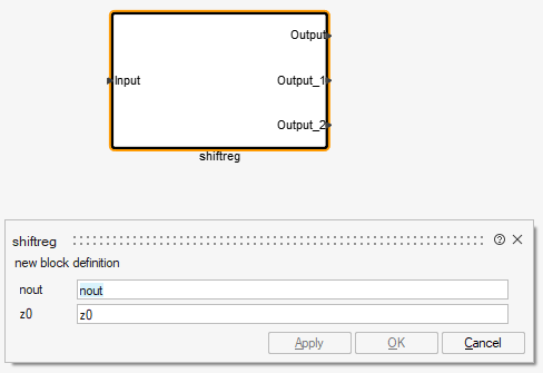 In this example, the initial condition is set to z0, which must be a parameter of the programmable super block. Links between blocks are established using the OML function vssAdd_Link. For instance, the following instruction connects the first output of the Input block to the first output of the DiscreteDelay block via a regular link: