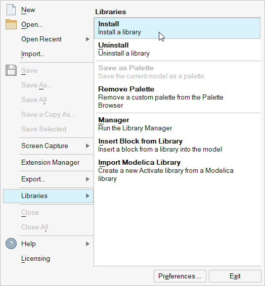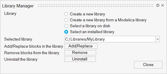 The Library Manager includes options for adding, replacing, and removing blocks in libraries, and installing/uninstalling libraries that have been added to Twin Activate.