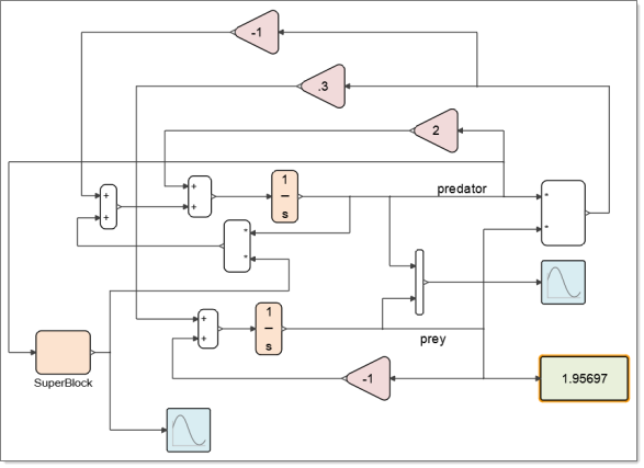The following example shows a diagram of a predator-prey model. A Display block is connected to the right of the diagram and is defined to display the fish population value. The Display block updates as the population evolves during the course of the simulation. The value highlighted in the figure is the last value at the final time of the simulation run.