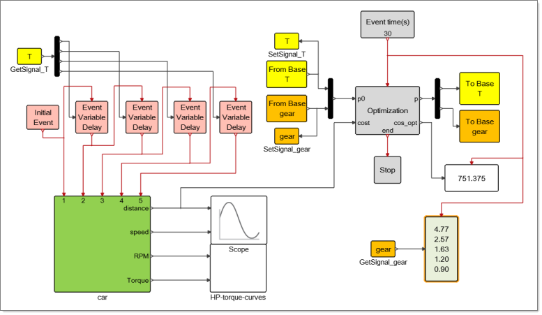 The Display block can also display vectors and matrices. The following example is from the Extended Definitions and shows in the green block the optimal gear box ratios obtained after optimization: