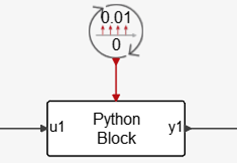 The generated Python code can be tested in the Activate environment using the PyCustomBlock. In this block, the simulation function of the block is defined in Python. In the case of the SuperBlock code discussed above, if the super block had one input and one output, the code can be tested in an Activate model as in the following image: