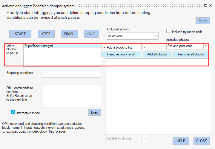 By default, the list of blocks to pause in is empty. If the simulation is started or continued using the START or CONTINUE buttons, it either runs to the end or pauses due to an error. The behavior in this case is like that of the FINISH button. If one or more blocks are selected, then a pause cannot occur in any other block other than the selected blocks, unless an error occurs in that other block. Regardless of the chosen filters, if an error occurs during simulation in debug mode inside a block, the simulation is paused in that block.