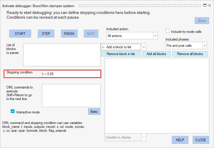 You can define pause conditions based on an OML expression. Write the OML expression in the Stopping condition field in the Twin Activate debugger dialog box. A pause occurs if the OML expression evaluates to true or 1.