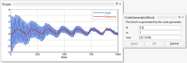 You can see the complete model in the following diagram where the measurement noise and the reference angle are provided. A Scope plots the actual angle and the reference angle. The frequency of the sampling is set to 10Hz. The parameter values are m=1, R=2 and num= [-0.1,0.04].