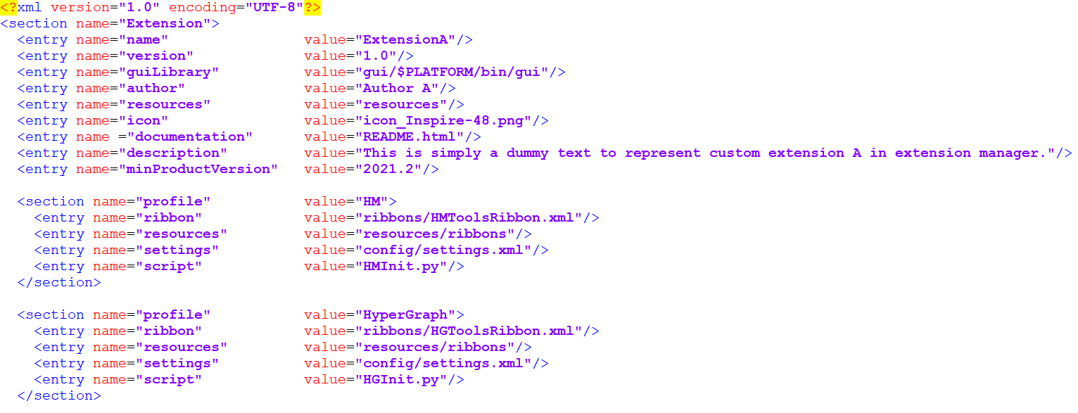 As defined in the previous code example, if the HyperMesh profile in Hyperworks loads a certain extension, the Extension Manager executes, for example, HMInit.py. Also if the profile is switched to HyperGraph, the Extension Manager does not unload the given extension.