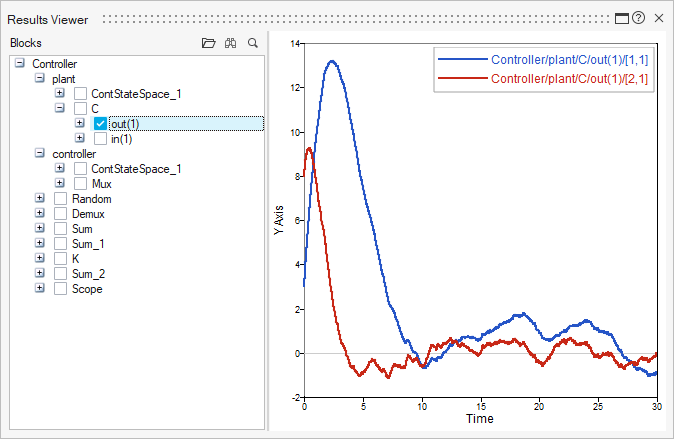 The Results Viewer lets you display the values of all blocks, including the Modelica blocks. Since Modelica blocks are processed by the Modelica Compiler, they appear in the Blocks pane of the Results Viewer in a branch starting with the prefix FMU_.