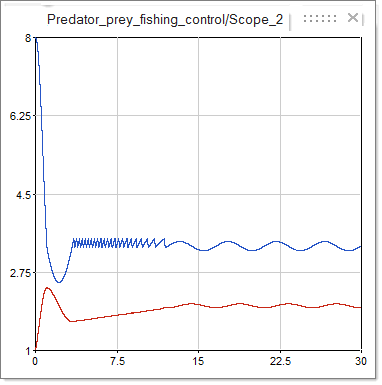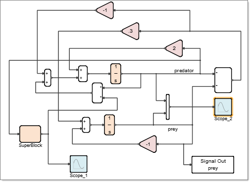You connect a scope block to each signal in a model that you want to review. In the following example of a classic predator-prey model, Scope_2 on the right of the diagram is defined to plot the evolution of population over time: