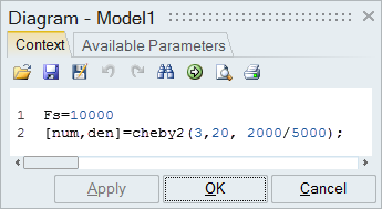 Apply the OML function, Cheby2, in a diagram context. The Cheby2 function generates the coefficient of the transfer function of the low pass filter.