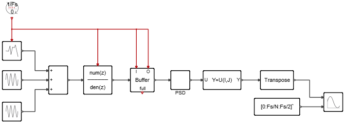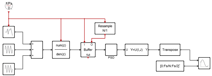 Learn how to generate a 1000 Hz plus 3000 Hz sinusoidal wave with additive noise, apply a Chebyshev Type II filter, compute a Fast Fourier Transform (FFT) and power spectral density, display simulation results in a vector scope, and downsample the output of a buffer.