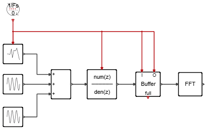 Both activation input ports of the Buffer block are triggered by the SampleClock block at 10,000Hz. This trigger forces the blocks downstream, including the FFT and VectorScope blocks, to run at 10,000Hz which can result in unnecessary computation and scope generation. The addition of the ReSampleClock block ensures that the Buffer block updates the output only when required.