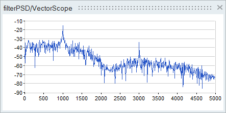 The power spectrum density graph appears as you see in the following figure. Two peaks at frequencies are present: 1000Hz and 3000Hz. The 3000Hz peak is lower because the original signal is attenuated by the Chebychev low-pass filter.
