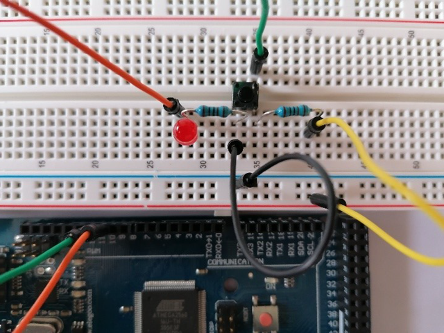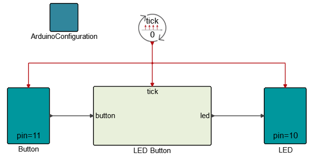 - Button block: This block represents the hardware button connected to pin 11 on the Arduino board.