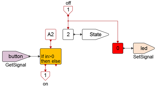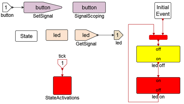 Initially the led off super block is activated through its activation input port. This process changes the state number to 2 and sets the led signal to zero. Subsequent activations come through the activation signal A2. No output activation is generated until the button signal becomes positive. Once the output activation is signaled on, it enters the led on super block.