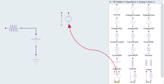 7. In the Palette Browser, from Spice > Analog > Basic, drag one Capacitor block into the current diagram, then double-click the block.